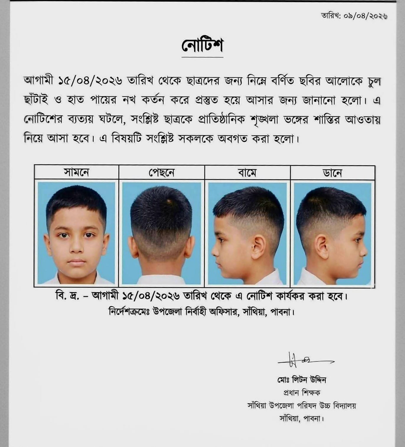 গত ০৯ এপ্রিল প্রকাশিত ওই নোটিশে স্পষ্ট উল্লেখ করা হয়েছে, আগামী ১৫ এপ্রিল থেকে শিক্ষার্থীদের নোটিশে প্রদর্শিত ছবির আদলে চুল ছেঁটে এবং হাত-পায়ের নখ কেটে বিদ্যালয়ে আসতে হবে।নোটিশে চারদিক থেকে তোলা একটি শিশুর চুলের কাটিংয়ের ছবি যুক্ত করা হয়েছে, যা অনেকটা ‘আর্মি কাট’ । নির্দেশনার ব্যত্যয় ঘটলে সংশ্লিষ্ট শিক্ষার্থীকে ‘প্রাতিষ্ঠানিক শৃঙ্খলা ভঙ্গের’ দায়ে শাস্তির আওতায় আনা হবে।চিঠির নিচে বিশেষ দ্রষ্টব্য দিয়ে জানানো হয়েছে, উপজেলা নির্বাহী অফিসার (ইউএনও), সাঁথিয়া-এর নির্দেশক্রমেই এই সিদ্ধান্ত কার্যকর করা হচ্ছে।