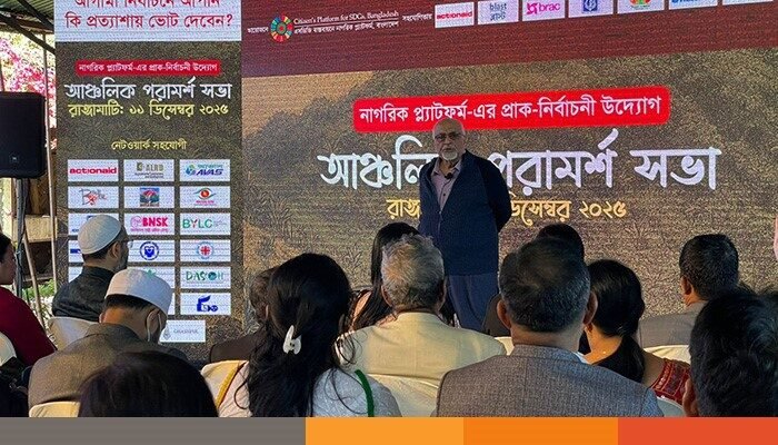 এদিন সকাল ১১টার পর বার্গী লেকভ্যালিতে অনুষ্ঠিত আঞ্চলিক পরামর্শ সভার সভাপতিত্ব ও মূল প্রবন্ধ উপস্থাপন করেন নাগরিক প্লাটফর্মের আহবায়ক ও সিপিডির সম্মানীয় ফেলো ড. দেবপ্রিয় ভট্টাচার্য। সমাপনী বক্তব্য রাখেন- সিপিডির সম্মানীয় ফেলো ও নাগরিক প্লাটফর্মের কোর গ্রুপ সদস্য অধ্যাপক মোস্তাফিজুর রহমান।