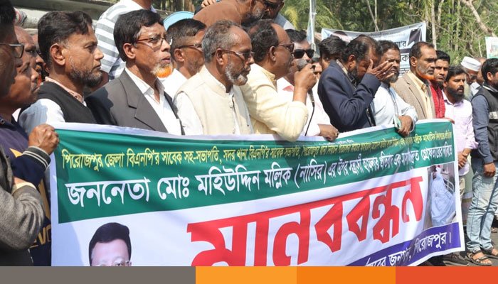 পিরোজপুর জেলা বিএনপির সাবেক সহ-সভাপতি ও সদর থানা বিএনপির সাবেক সভাপতি মো. মহিউদ্দিন মল্লিক নাসিরের ওপর সন্ত্রাসী হামলার প্রতিবাদে মানববন্ধন অনুষ্ঠিত হয়েছে।