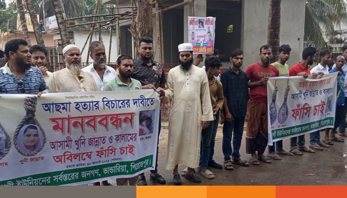 পিরোজপুরের ভান্ডারিয়া উপজেলার জুনিয়া গ্রামে গৃহবধূ আসমা বেগম (৫০) হত্যার ঘটনায় জড়িতদের সর্বোচ্চ শাস্তি, অর্থাৎ মৃত্যুদণ্ডের দাবিতে মানববন্ধন অনুষ্ঠিত হয়েছে। সোমবার (১৫ সেপ্টেম্বর) দুপুরে পিরোজপুর জেলা জজ আদালত চত্বরে নিহতের স্বজন ও এলাকাবাসী এই মানববন্ধনের আয়োজন করেন।