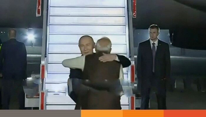 বিমান থেকে নামার সঙ্গে সঙ্গে রুশ প্রেসিডেন্টকে আবেগাপ্লুত হয়ে জড়িয়ে ধরেন ভারতের প্রধানমন্ত্রী। সেখান থেকে একই গাড়িতে করে যাত্রা শুরুর আগে দুই নেতা করমর্দন করেন এবং পরস্পরকে জড়িয়ে ধরেন।
