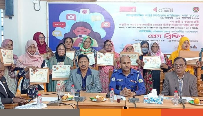 বক্তারা বলেন, ডিজিটাল প্রযুক্তির বিস্তারের ফলে নারী ও কিশোরীরা অনলাইনে হয়রানি, ব্ল্যাকমেইল, সাইবার বুলিং ও মানহানির মতো সহিংসতার শিকার হচ্ছেন, যা ভুক্তভোগীদের মানসিক স্বাস্থ্য ও সামাজিক নিরাপত্তার ওপর মারাত্মক প্রভাব ফেলছে। তারা ডিজিটাল নিরাপত্তা বিষয়ে জনসচেতনতা বৃদ্ধি, ভুক্তভোগীদের জন্য সহজ অভিযোগ ব্যবস্থাপনা, দ্রুত আইনি সহায়তা এবং অপরাধীদের বিরুদ্ধে কার্যকর ব্যবস্থা গ্রহণের ওপর গুরুত্বারোপ করেন। অনুষ্ঠানে বিভিন্ন ক্ষেত্রে সফল অবদানের জন্য ১৪ জন নারী প্রতিনিধিকে সম্মাননা প্রদান করা হয়। প্রেস ব্রিফিংয়ে জেলা ও উপজেলা পর্যায়ের সচেতন নাগরিক, শিক্ষাবিদ ও সামাজিক সংগঠনের প্রতিনিধিসহ মোট ৪৬ জন অংশগ্রহণ করেন।
