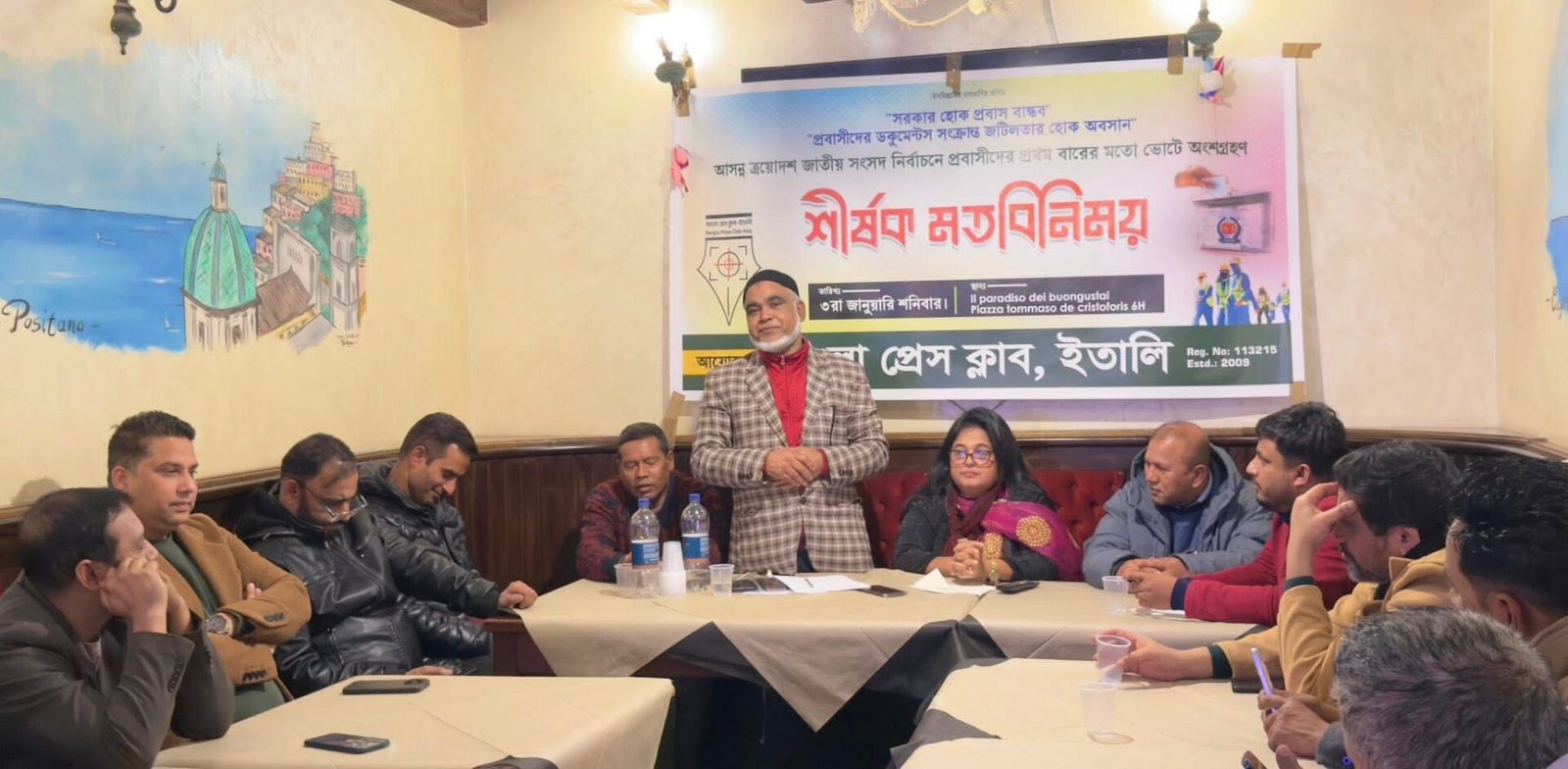 বাংলা প্রেস ক্লাব ইতালির আয়োজনে  আসন্ন ত্রয়োদশ জাতীয় সংসদ নির্বাচনে প্রবাসীদের প্রথম বারের মতো ভোটে অংশগ্রহণের মধ্যে দিয়ে প্রবাস বান্ধব সরকার এবং প্রবাসীদের ডকুমেন্টস সংক্রান্ত জটিলতার নিরসন বিষয়ক একটি মত বিনিময় সভা অনুষ্ঠিত হয়েছে।