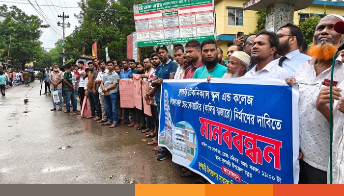 প্রস্তাবিত সরকারি টেকনিক্যাল স্কুল ও কলেজ কালিরবাজার উপজেলা হেডকোয়ার্টারে স্থাপনের দাবীতে রবিবার (৭ সেপ্টেম্বর) মানববন্ধন কর্মসূচী পালন করেন স্থানীয়রা।