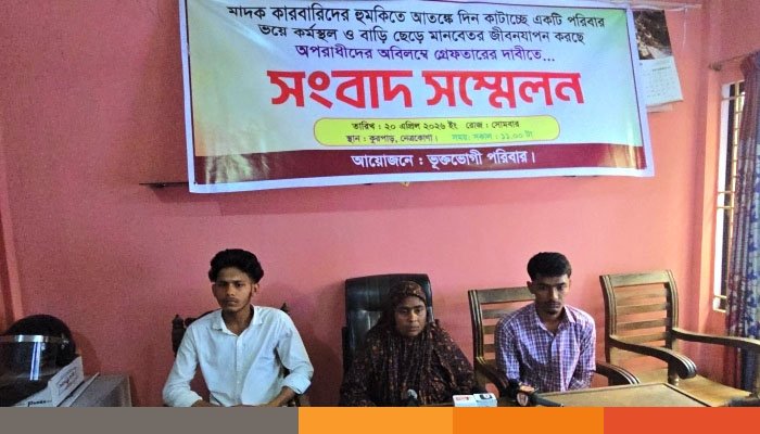 মাদক কারবারিদের অব্যাহত প্রাণনাশের হুমকিতে কর্মস্থল ও নিজ বাড়ি ছেড়ে চরম নিরাপত্তাহীনতায় দিন কাটাচ্ছে নেত্রকোনার একটি পরিবার। হামলা, মারধর ও অপহরণের ভয়ে বর্তমানে আত্মীয়ের বাড়িতে আত্মগোপনে মানবেতর জীবনযাপন করছেন তারা।
