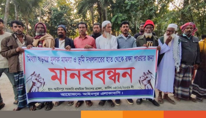 ফরিদপুরের নগরকান্দা উপজেলার লস্করদিয়া ইউনিয়নের আইনপুর গ্রামে ত্রাস সৃষ্টি ও জমি দখলের অভিযোগ তুলে মানববন্ধন ও সংবাদ সম্মেলন করেছেন স্থানীয় গ্রামবাসী।