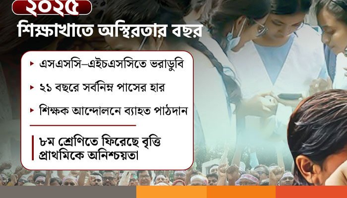 বই বিতরণে বিলম্ব, ফল বিপর্যয়, ধারাবাহিক শিক্ষক আন্দোলন এবং প্রশাসনিক দুর্বলতা– সবকিছু মিলিয়ে পুরো বছরজুড়ে শিক্ষাখাত চরম চাপের মুখে ছিল। যা এই খাতের ব্যবস্থাপনাগত সীমাবদ্ধতা ও নীতিগত চ্যালেঞ্জগুলোকে স্পষ্টভাবে ফুটিয়ে তুলেছে। একইসঙ্গে, বিভিন্ন ছাত্রসংগঠনের কর্মকাণ্ড ও ছাত্রদল নেতাদের তৎপরতা রাজনৈতিক অঙ্গনে বিশেষ আলোচনার খোরাক জুগিয়েছে।দুই পরীক্ষার পাসের হারে ধস