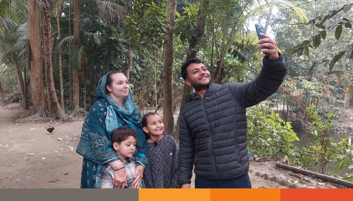 সম্প্রতি এই দম্পতি পরিবার নিয়ে এসেছেন রাসেলের গ্রামের বাড়ি, লক্ষ্মীপুর সদর উপজেলার রাজিবপুরে। কয়েক বছর পর গ্রামে ফিরে স্ত্রী-সন্তানকে নিয়ে কাটাচ্ছেন প্রশান্তিময় সময়। স্থানীয়দের সঙ্গে সহজভাবে মিশে যাওয়া, খোলা মেঠোপথে হাঁটা, হাওয়াই মিঠাই খাওয়া, নদীর পাড়ে সময় কাটানো- সব কিছুতেই মুগ্ধ ফরাসি বধূ।