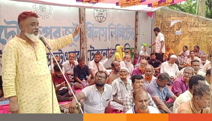 বকেয়া পাওনা পরিশোধ, লে-অফ ঘোষণা বাতিল এবং বন্ধ সরকারি জুট মিল পুণরায় চালুর দাবিতে খুলনায় অবস্থান ধর্মঘট পালন করেছেন দৌলতপুর জুট মিলের শ্রমিকরা।