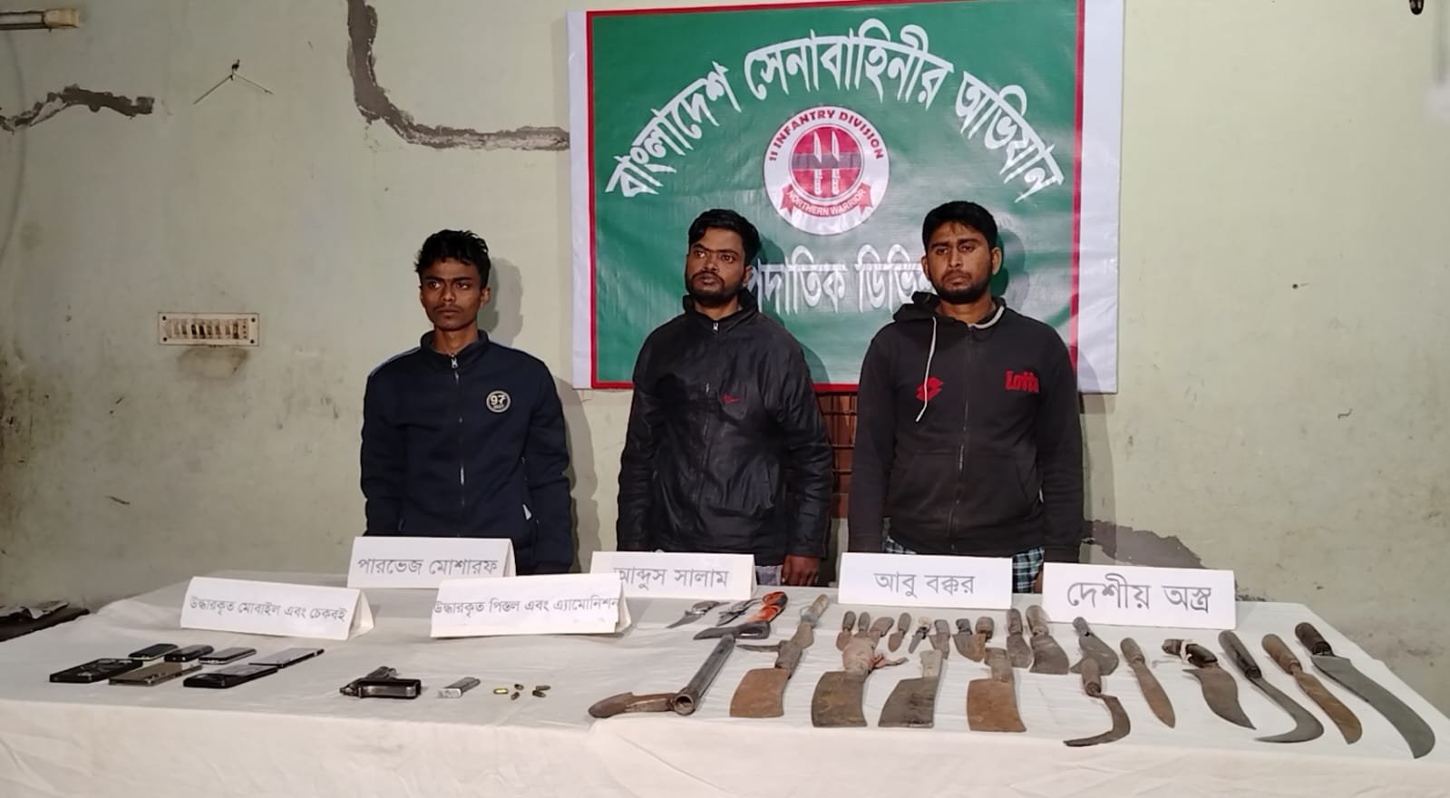 শাজাহানপুর আর্মি ক্যাম্পের মেজর মেহেদী হাসান, ক্যাপ্টেন জিসান ও লেফটেন্যান্ট ফাতিনের নেতৃত্বে পরিচালিত অভিযানে তাদের আটক করা হয়। অভিযানের সময় তাদের কাছ থেকে দেশীয় অস্ত্র ও একটি বিদেশি পিস্তল উদ্ধার করা হয়েছে বলে সেনাবাহিনী সূত্রে জানা গেছে। গ্রেফতারদের বিরুদ্ধে আইনগত প্রক্রিয়া চলমান রয়েছে।