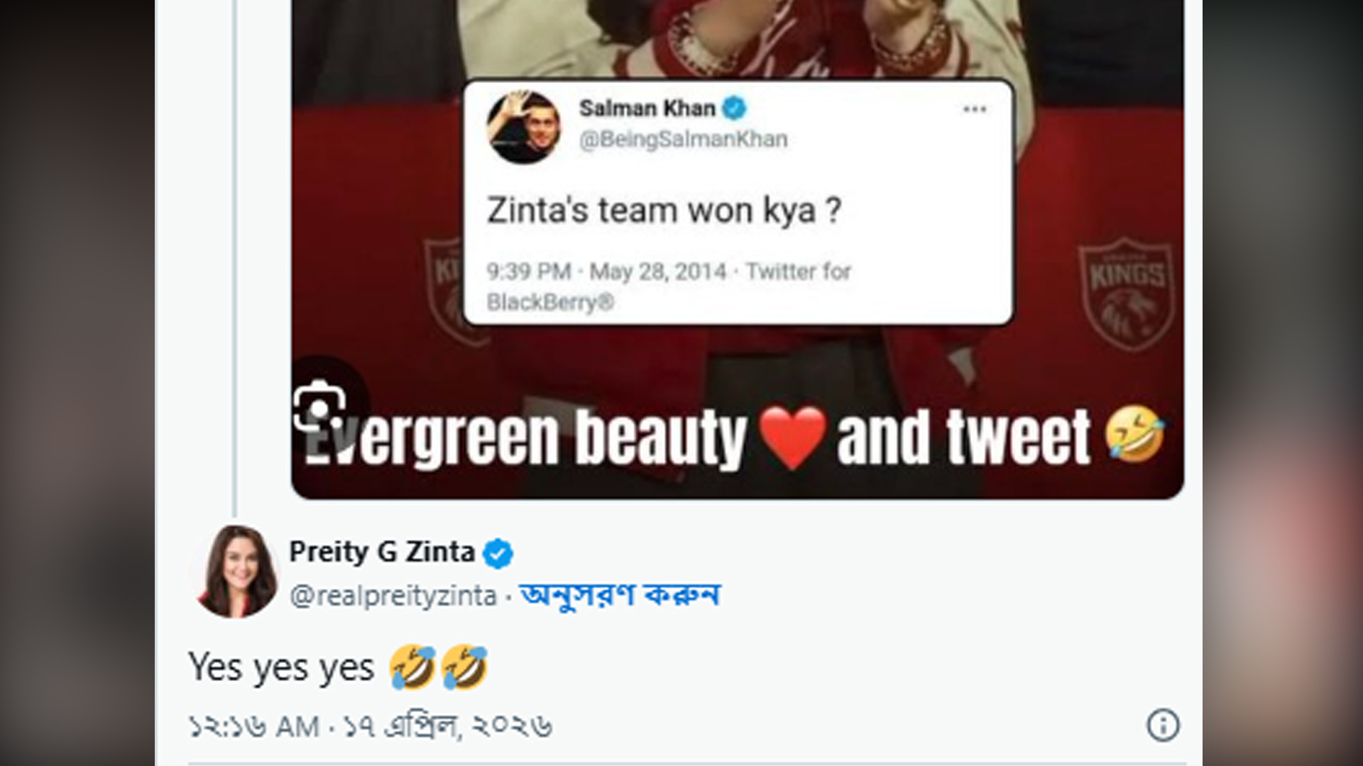 এরপরই দীর্ঘ ১২ বছরের পুরনো পোস্ট ২০২৬ সালে আবারও সামনে আনেন সালমান নিজেই। আর এবার সেই টুইটের জবাব দিয়েছেন প্রীতি জিনতা। টুইটারে বেশ কয়েকটি প্রফুল্ল ভঙ্গিতে ছবি দিয়ে তিনবার নায়িকা জানান ‘হ্যাঁ’। তার এই প্রতিক্রিয়া যেন এক দশক আগের মজার কথোপকথনের সুন্দর সমাপ্তি টেনে দিল।