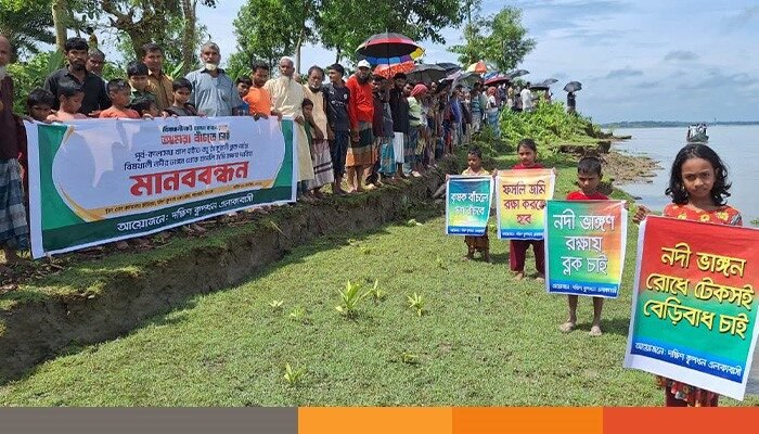 বরগুনার বিষখালি নদী ভাঙ্গন কবল থেকে আমরা বাঁচতে চাই,ত্রাণ চাই না টেকসই বেরিবাঁধ চাই। নদী ভাঙ্গন রক্ষায় ব্লক চাই,ফসলি জমি রক্ষা করতে হবে, কৃষক বাঁচলে দেশ বাঁচাতে এরকম বিভিন্ন স্লোগানে পূর্ব-কালমেঘা খাল হইতে বধু ঠাকুরানী ব্লক পর্যন্ত প্রায় ৩ কিলোমিটার বিষখালি নদীর ভাঙ্গন থেকে ফসলী জমি রক্ষার দাবিতে মানববন্ধন।