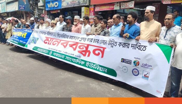 বরগুনা-বাকেরগঞ্জ মহাসড়ক চার লেনে উন্নীতকরণের দাবীতে মানববন্ধন