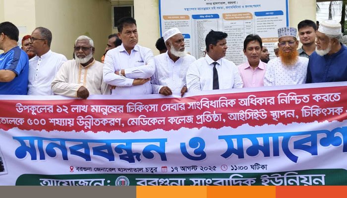 বরগুনায় মেডিকেল কলেজ প্রতিষ্ঠা ও হাসপাতালকে ৫০০ শয্যায় উন্নীত করার দাবিতে মানববন্ধন