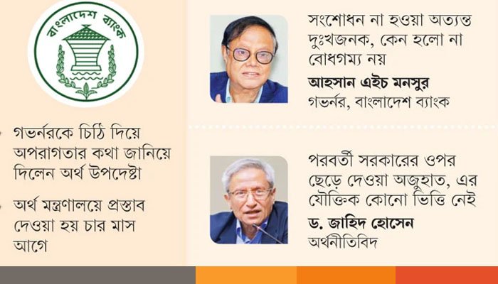 জানতে চাইলে বাংলাদেশ ব্যাংকের গভর্নর ড. আহসান এইচ মনসুর সমকালকে বলেন, এরকম চিঠি এখনও তাঁর হাতে আসেনি। তবে এই সরকারের সময়ে বাংলাদেশ ব্যাংক অর্ডার সংশোধনী না হওয়াটা অত্যন্ত দুঃখজনক। কেন হলো না তা বোধগম্য নয়। আর্থিক খাতের জন্য এটি খুবই দরকার। পরবর্তী সরকারের সঙ্গে আলোচনা করে সংশোধনী প্রস্তাব কার্যকরের চেষ্টা করবেন তিনি।