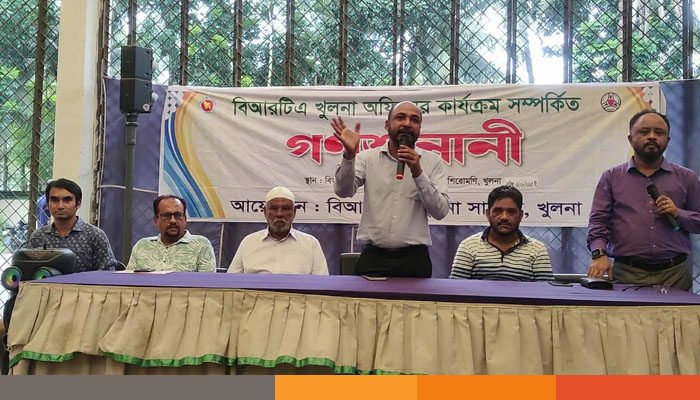 বিআরটিএ খুলনা অফিসের যাবতীয় কার্যক্রম সম্পর্কে গণশুনানি সোমবার বেলা ২টায় বিআরটিএ খুলনা সার্কেল কার্যালয়ে অনুষ্ঠিত হয়। বিআরটিএ খুলনা সার্কেলের সহকারী পরিচালক (ইঞ্জিঃ) উসমান সরওয়ার আলমের সভাপতিত্বে এবং মোটরযান পরিদর্শক সাইফুল ইসলামের সঞ্চালনায় প্রধান অতিথি ছিলেন খুলনা বিভাগীয় বিআরটিএ কার্যালয়রে পরিচালক (ইঞ্জিঃ) মোঃ জিয়াউর রহমান পিএএ। বিশেষ অতিথি ছিলেন খুলনা বিআরটিএ ম্যাজিস্ট্রেট ও সিনিয়র সহকারী সচিব মেজবাহ উদ্দিন, খুলনা ডেপুটি সিভিল সার্জন মোঃ সৈকত হাসান, মোটর শ্রমিক ইউনিয়নের সভাপতি জাহিদ খান, ট্র্যাক মালিক সমিতির সম্পাদক ওয়াহিদুল ইসলাম, মিনিবাস মালিক সমিতির সভাপতি বীর মুক্তিযোদ্ধা মোলা মুজিবর রহমান।