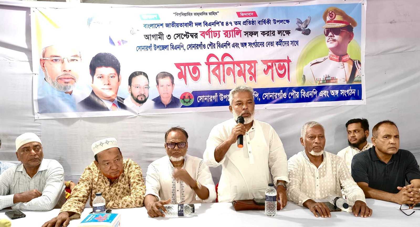 বাংলাদেশ জাতীয়তাবাদী দল বিএনপির ৪৭ তম প্রতিষ্ঠা বার্ষিকী উপলক্ষে আগামী ৩ সেপ্টেম্বর নারায়ণগঞ্জের সোনারগাঁয়ে বর্ণাঢ্য র্যালি সফল করার লক্ষ্যে উপজেলা বিএনপি, পৌর বিএনপি ও অঙ্গসংগঠনের নেতাকর্মীদের উপস্থিতিতে আলোচনা, দোয়া ও মতবিনিময় সভা অনুষ্ঠিত হয়েছে।