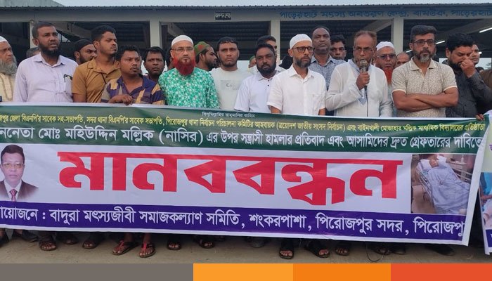 পিরোজপুর সদর উপজেলা বিএনপি’র এক নেতাকে নির্মমভাবে কুপিয়ে জখম করার ঘটনায় জড়িতদের দৃষ্টান্তমূলক শাস্তির দাবিতে মানববন্ধন করেছে স্থানীয় মৎস ব্যবসায়ী ও মৎসজীবীরা। শুক্রবার সকালে পিরোজপুর সদর উপজেলার পাড়েরহাট মৎস অবতারণ কেন্দ্রে এ মানববন্ধন হয়।