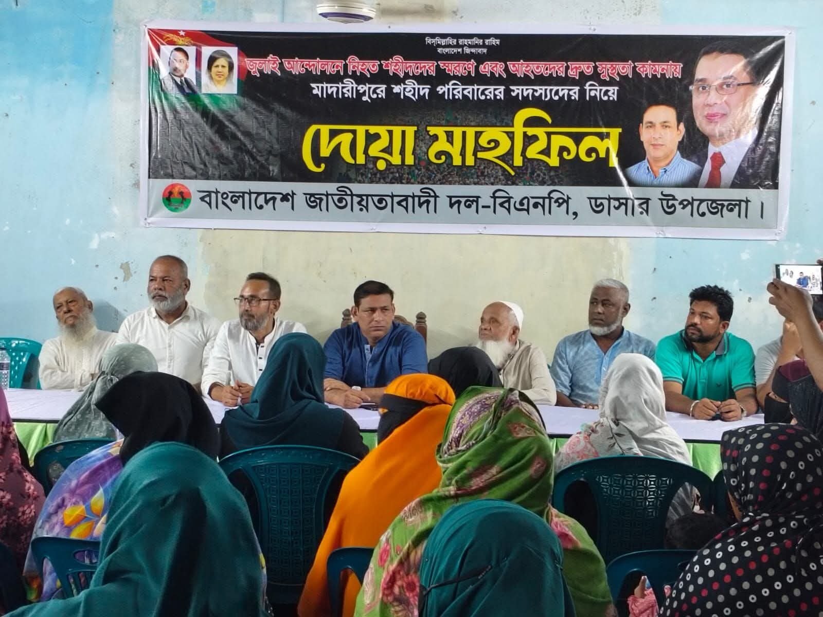 শনিবার (৩০ আগস্ট) বিকেলে মাদারীপুরের ডাসার উপজেলা বিএনপির আয়োজনে জুলাই আন্দোলনে নিহত শহীদদের স্মরণে ও আহতদের দ্রুত সুস্থতা কামনায় দোয়া মাহফিল অনুষ্ঠিত হয়।