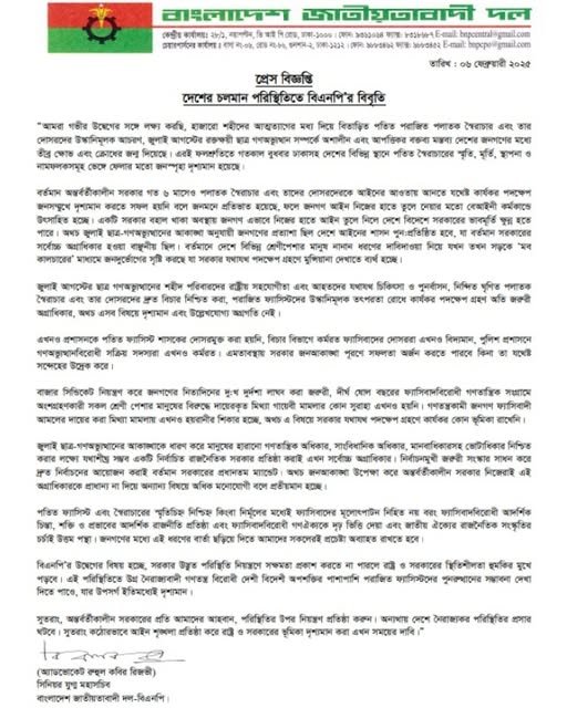 দলটির জেষ্ঠ্যে যুগ্ম-মহাসচিব রুহুল কবির রিজভী স্বাক্ষরিত বিবৃতিতে বলা হয়, বিএনপির উদ্বেগের বিষয় হচ্ছে, সরকার উদ্ভূত পরিস্থিতি নিয়ন্ত্রণে সক্ষমতা প্রকাশ করতে না পারলে রাষ্ট্র ও সরকারের স্থিতিশীলতা হুমকির মুখে পড়বে। এমন অবস্থায় উগ্র নৈরাজ্যবাদ গনতন্ত্র বিরোধী দেশী বিদেশী অপশক্তির পাশাপাশি ফ্যাসিস্টদের পুনরুথ্থানের সম্ভাবনা দেখা দিতে পারে।ইতিমধ্যে যার উপসর্গ দৃশ্যমান।