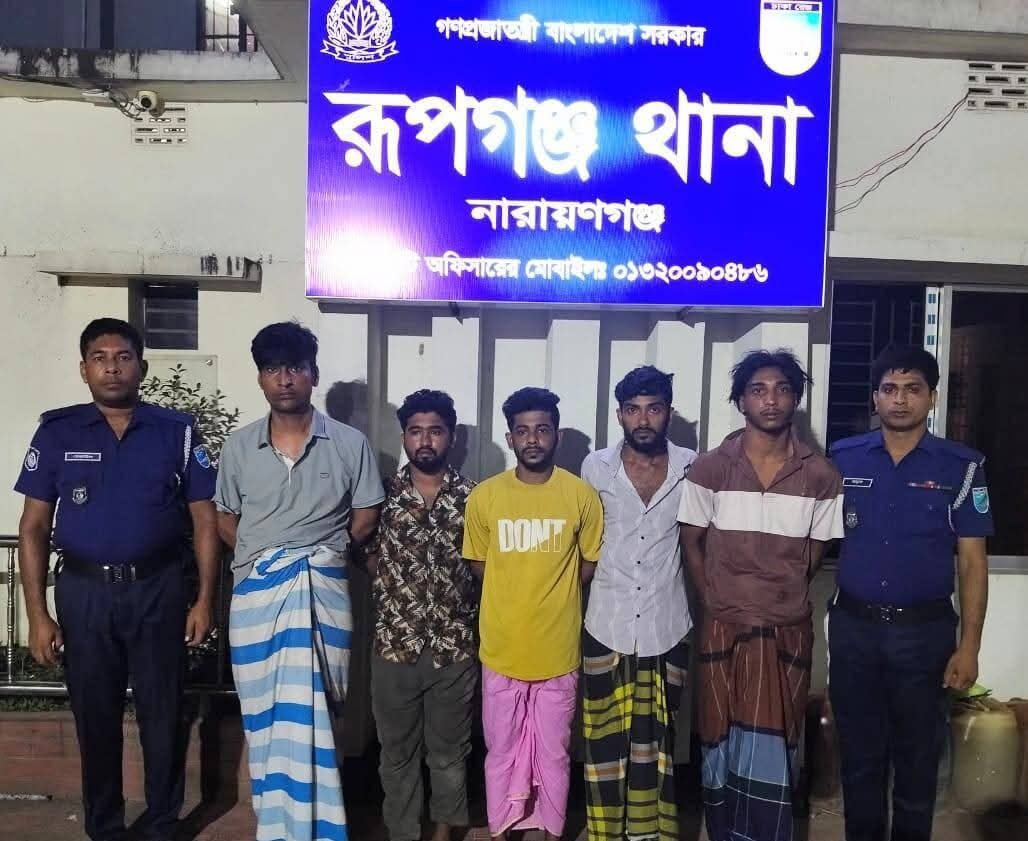 গ্রেফতারকৃতরা হলো- রূপগঞ্জের মুড়াপাড়ার মাছিমপুর মিরগদাই এলাকার সিরাজুল ইসলামের পরিত্যক্ত বাড়ি থেকে মাছিমপুরের রমজান মোল্লা (৩৫), পাড়াগাঁওয়ের মোঃ সবুজ মিয়া (২৬), ছোনাবো এলাকার মেহেদী হাসান (২৫), ব্রাহ্মণগাঁও এলাকার এনামুল হক(১৯) ও ভুলতা ইউনিয়নের ভায়েলা এলাকার সুমন মিয়া (২৪)।