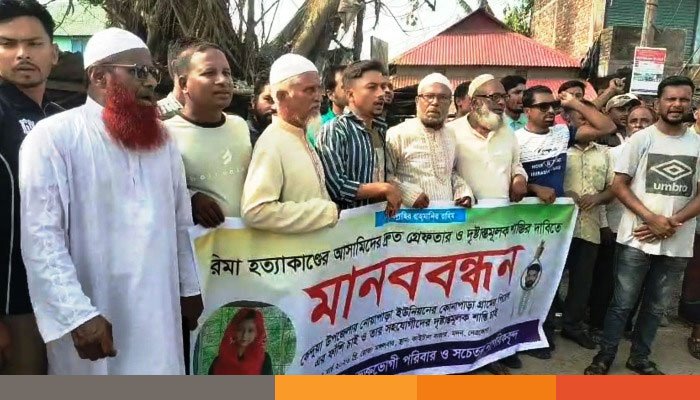 মানববন্ধনে অংশ নেওয়া স্থানীয় এক প্রবীণ ব্যক্তি চাঞ্চল্যকর অভিযোগ তুলে বলেন, “আমাদের গ্রামের মেয়ে রিমা চট্টগ্রামে চাকরি করতো। সেখানে তাকে পাশবিক নির্যাতন করা হয়। পরবর্তীতে মামলা থেকে বাঁচতে তড়িঘড়ি করে কাগজপত্রের মাধ্যমে তাকে বিয়ে দেওয়া হয়। কিন্তু তারা সংসার করার জন্য বিয়ে করেনি। পরবর্তীতে রাতের আঁধারে পরিকল্পিতভাবে মেয়েটিকে তারা মেরে ফেলেছে।”