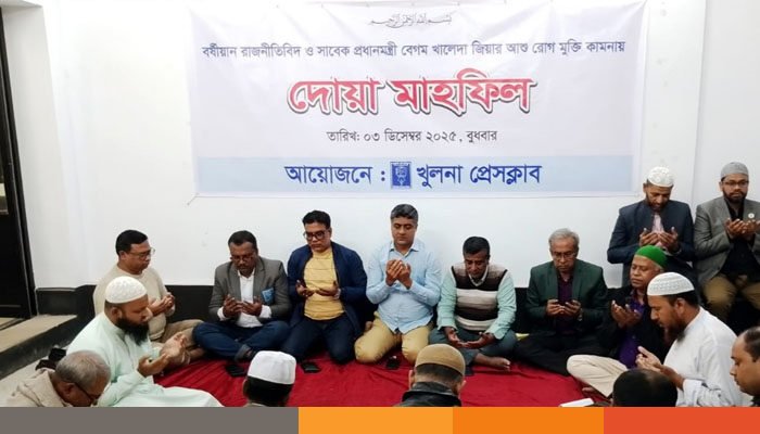 বর্ষীয়ান রাজনীতিবিদ ও সাবেক প্রধানমন্ত্রী বেগম খালেদা জিয়ার আশু রোগমুক্তি কামনায় খুলনা প্রেসক্লাবের আয়োজনে বুধবার বাদ আসর ক্লাবের মেম্বার লাউঞ্জে দোয়া মাহফিল অনুষ্ঠিত হয়।