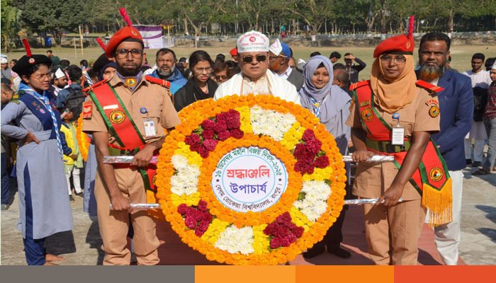 স্বাধীনতা স্মারকে মহান মুক্তিযুদ্ধের শহীদদের শ্রদ্ধা জানিয়ে পুষ্পস্তবক অর্পণ করেন উপাচার্য প্রফেসর ড. মোঃ শওকাত আলী। এরপর পর্যায়ক্রমে বিশ্ববিদ্যালয়ের বিভিন্ন অনুষদ, বিভাগ, দপ্তর ও আবাসিক হলগুলোর পক্ষ থেকে শ্রদ্ধাঞ্জলি অর্পণ করা হয়। এছাড়াও বিশ্ববিদ্যালয়ের বিভিন্ন সামাজিক ও সাংস্কৃতিক সংগঠনের পক্ষ থেকে শ্রদ্ধাঞ্জলি অর্পণ করা হয়। এর আগে বিজয় দিবসের প্রথম প্রহরে স্বাধীনতা স্মারকে শ্রদ্ধাঞ্জলি অর্পণ করেন উপাচার্য।