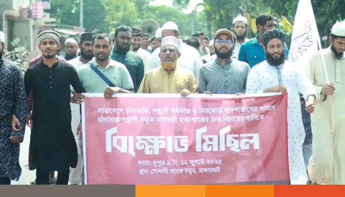 সারাদেশে চাঁদাবাজি, সন্ত্রাসী কর্মকাণ্ড ও মিডফোর্ড হাসপাতালের সামনে চাঁদাবাজ সন্ত্রাসী কর্তৃক ব্যবসায়ী হত্যাকাণ্ডের দ্রুত বিচারের দাবিতে বিক্ষোভ মিছিল বের করে রাজারহাট উপজেলার সর্বস্তরের ছাত্র-জনতা।