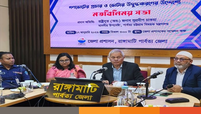 শনিবার (১৭ জানুয়ারি) বিকেলে রাঙামাটি জেলপ্রশাসক কার্যালয়ের সম্মেলনে কক্ষে ‘গণভোটের প্রচার ও ভোটার উদ্বুদ্ধকরণ’র উদ্দেশ্যে এক মতবিনিময় সভায় প্রধান অতিথি বক্তব্য তিনি এসব কথা বলেন।