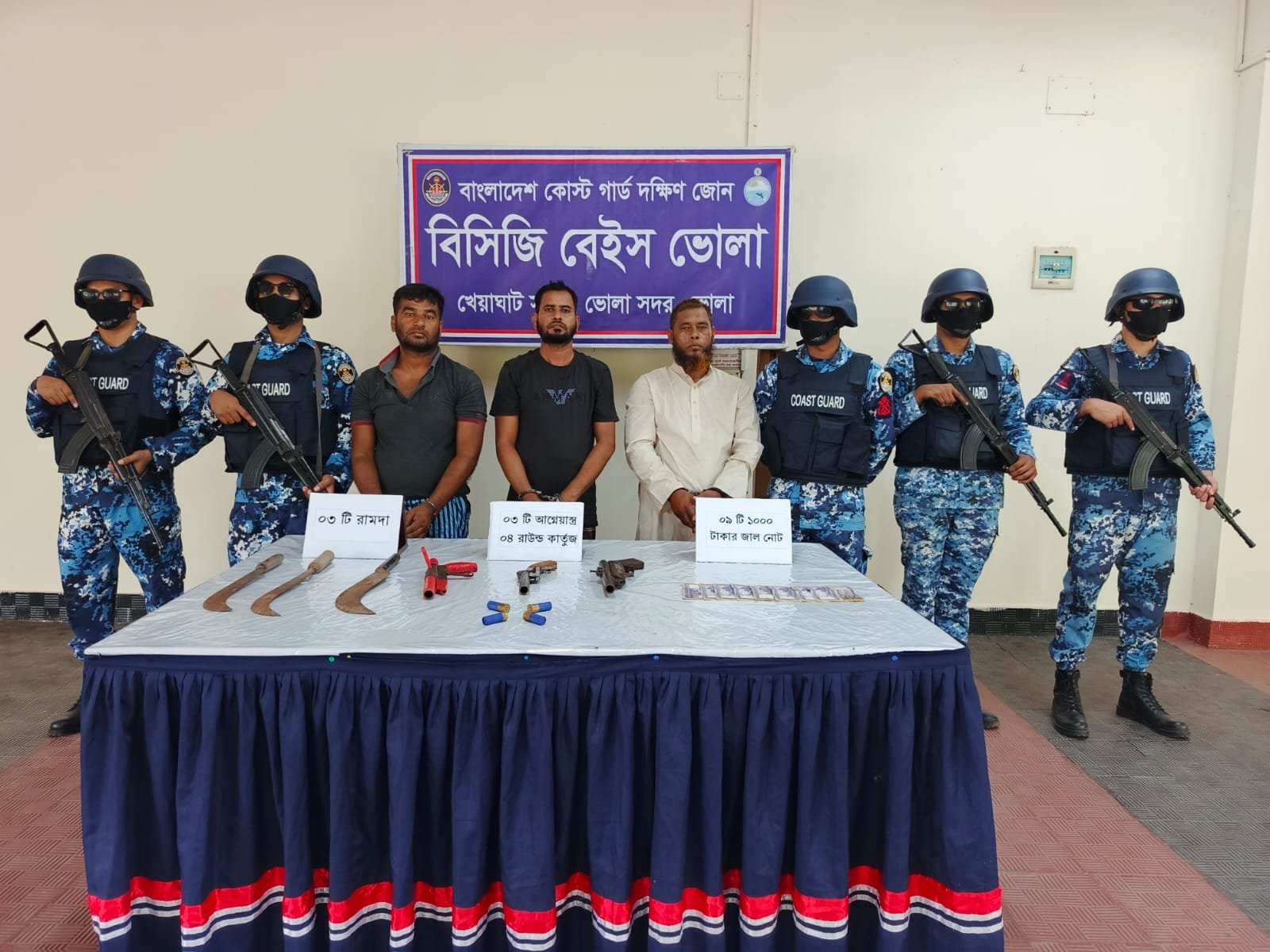 এদিকে আজ শুক্রবার সকালে ভোলা খেয়াঘাট সংলগ্ন কোস্ট গার্ড কার্যালয়ে এ বিষয়ে একটি সংবাদ সম্মেলন অনুষ্ঠিত হয়। এসময় কোস্টগার্ড দক্ষিণ জোনের অপারেশন স্টাফ অফিসার লেঃ কমান্ডার রিফাত আহমেদ জানান, গোপন সংবাদের ভিত্তিতে বৃহস্পতিবার মধ্যরাতে কোস্ট গার্ডের সদস্যরা ভোলার দৌলতখান উপজেলাধীন মদনপুরের চর এলাকায় একটি বিশেষ অভিযান পরিচালনা করেন। অভিযানে ডাকাত আলাউদ্দিন (৪৫), জহির উদ্দিন বাবর (৪৮) ও লোকমান (৪২) কে ৩ টি দেশীয় আগ্নেয়াস্ত্র, ৩ টি দেশীয় অস্ত্র, ৪ রাউন্ড কার্তুজ এবং ৯টি ১ হাজার টাকার জাল নোটসহ আটক করা হয়েছে।