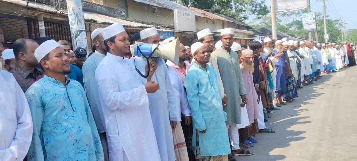 মানববন্ধনে সকল শ্রেণীপেশার কয়েকশ মানুষ অংশ নিয়ে সাজানো মামলা প্রত্যাহার ও আবু তাহের মাওলানা এবং তার ছেলে মিজান এবং ওবায়দুর রহমানের বিচার দাবী করেছে।