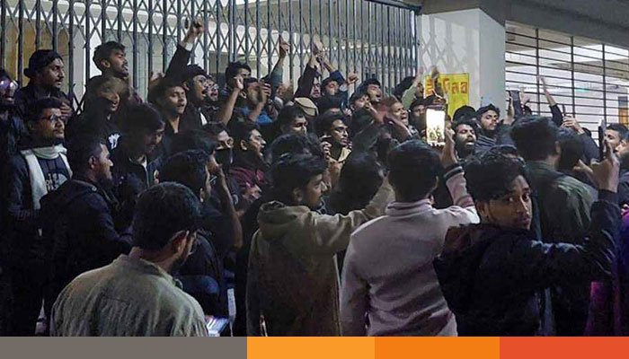 বাংলাদেশ নির্বাচন কমিশন একটি প্রজ্ঞাপন জারির পর উত্তাল হয়ে উঠেছে শাহজালাল বিজ্ঞান ও প্রযুক্তি বিশ্ববিদ্যালয়। সোমবার (১২ জানুয়ারি) দিবাগত মধ্যরাতে বিশ্ববিদ্যালয়ের গোল চত্বর এলাকা থেকে মিছিল নিয়ে নির্বাচন কমিশনের কার্যালয়ের সামনে অবস্থান নিয়েছেন শিক্ষার্থীরা।