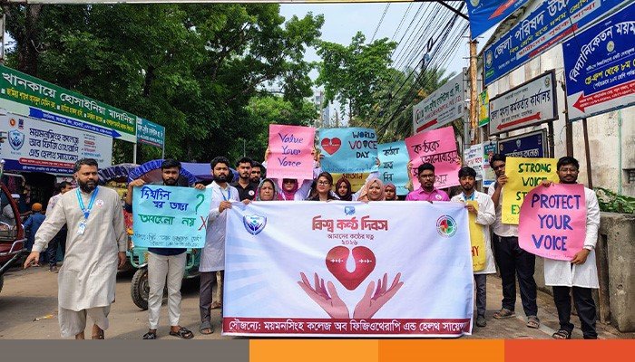 ১৬ এপ্রিল বৃহস্পতিবার বিশ্ব কণ্ঠ দিবস। দিবসটির এবারের প্রতিপাদ্য হলো ‘আপনার কণ্ঠ থাকুক উচ্চকিত অর্থাৎ শানিত হোক কণ্ঠস্বর’। এই স্লোগান কে সামনে রেখে প্রতিবারের মত এবারও ময়মনসিংহ কলেজ অব ফিজিওথেরাপি এণ্ড হেলথ সায়েন্সেস ও বেলা রিহ্যাবিলিটেশন হাসপাতাল দিবসটি পালন করে।এ উপলক্ষে শোভাযাত্রা ও আলোচনা সভা অনুষ্ঠিত হয়। কলেজ ক্যাম্পাস থেকে বর্ণাঢ্য শোভাযাত্রা বের হয়ে শহরের প্রধান প্রধান সড়ক প্রদক্ষিণ করে ক্যাম্পাসে এসে শেষ হয় ।