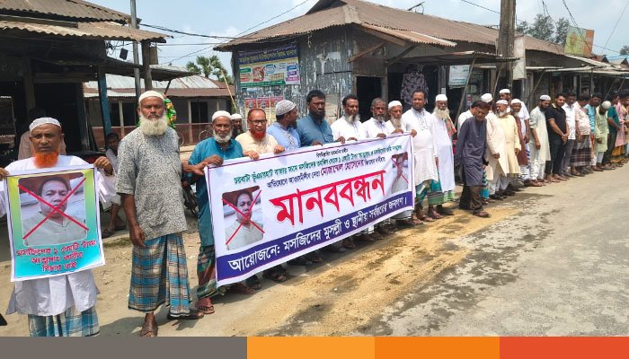 মানববন্ধনে মসজিদ কমিটির সভাপতি নুরুল হুদা মিয়া, সহ-সভাপতি হাজী নূরুল হুদা, যুগ্ম সাধারণ সম্পাদক মো. সোহেল, কোষাধ্যক্ষ মো. আমিরসহ স্থানীয় গণ্যমান্য ব্যক্তিরা বক্তব্য দেন।