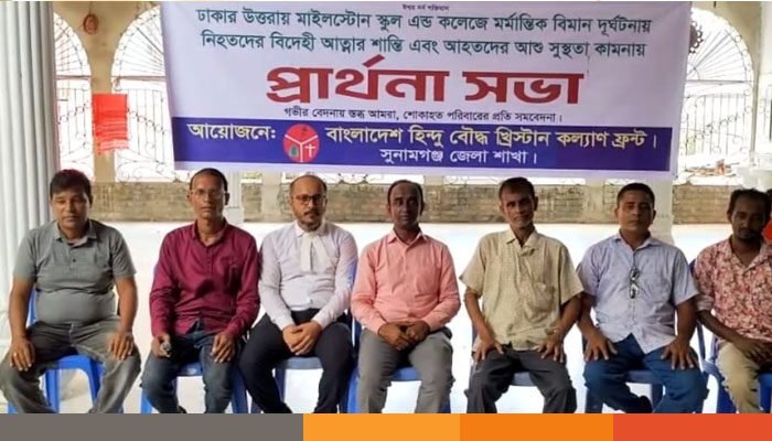 ঢাকার উত্তরায় মাইলস্টোন স্কুল এন্ড কলেজে বিমান বাহিনীর একটি প্রশিক্ষণ বিমান দুর্ঘটনায় অনেক কোমলমতি শিক্ষার্থী, অভিভাবক, শিক্ষক নিহত ও আহতের ঘটনায় সুনামগঞ্জে প্রার্থনা সভা অনুষ্ঠিত হয়েছে। আজ বৃহস্পতিবার দুপুর ১২টায় বাংলাদেশ হিন্দু বৌদ্ধ খ্রিস্টান কল্যাণ ফ্রন্টের আয়োজনে সুনামগঞ্জ শহরের শ্রী শ্রী জগন্নাথ জিউর মন্দির প্রাঙ্গণে এই সভা অনুষ্ঠিত হয়।