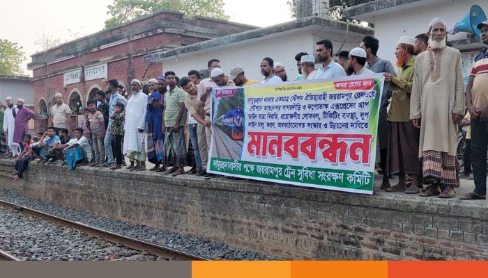 সোমবার (২৩ মার্চ) বিকেল ৪ টার দিকে স্টেশন চত্বরে স্থানীয় বাসিন্দাদের পক্ষ থেকে গঠিত জয়রামপুর ট্রেন সুবিধা সংরক্ষণ কমিটি এই মানববন্ধনের আয়োজন করে।