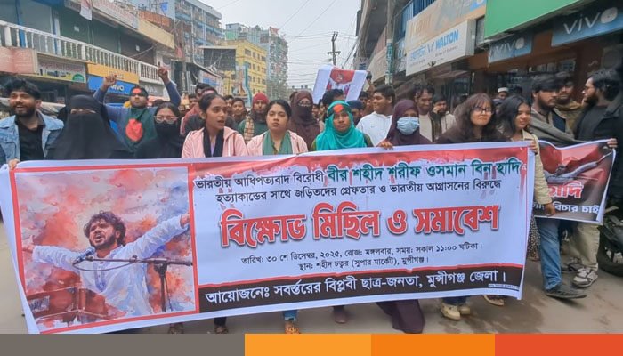 মুন্সীগঞ্জে শরিফ ওসমান হাদি হত্যাকাণ্ডের বিচারের দাবিতে বিক্ষোভ মিছিল ও সমাবেশ অনুষ্ঠিত হয়েছে। মঙ্গলবার সকাল ১১টার দিকে উপজেলার থানারপুল এলাকা থেকে বিক্ষোভ মিছিলটি শুরু হয়।