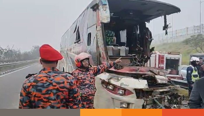 শ্রীনগর ফায়ার সার্ভিস এন্ড সিভিল ডিফেন্স সূত্রে জানা যায়, এক্সপ্রেসওয়ের ঢাকামুখী লেনে থেমে থাকা একটি পণ্যবাহী ট্রাকের পেছনে পূর্বাশা পরিবহনের একটি যাত্রীবাহী বাস সজোরে ধাক্কা দেয়। এতে বাসটির সামনের অংশ দুমড়েমুচড়ে যায় এবং বাসের ভেতরে বেশ কয়েকজন যাত্রী আটকে পড়েন। ঘটনাস্থলেই একজনের মৃত্যু হয় এবং অন্তত ১৫ জন আহত হন।