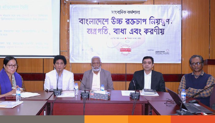 মঙ্গলবার (২৩ ডিসেম্বর) রাজধানীর বিএমএ ভবনে “উচ্চ রক্তচাপ নিয়ন্ত্রণ : অগ্রগতি, বাধা এবং করণীয়” শীর্ষক সাংবাদিক কর্মশালায় এ বিষয়গুলো নিয়ে বিস্তারিত আলোচনা হয়। কর্মশালার আয়োজন করে প্রজ্ঞা (প্রগতির জন্য জ্ঞান) গ্লোবাল হেলথ অ্যাডভোকেসি ইনকিউবেটরের (জিএইচএআই) সহযোগিতায়। এতে প্রিন্ট, টেলিভিশন এবং অনলাইন মিডিয়ায় কর্মরত ২৮ জন সাংবাদিক অংশগ্রহণ করেন।