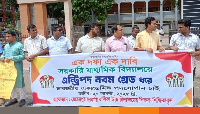 সরকারি মাধ্যমিক বিদ্যালয়ে এন্ট্রিপদ নবম গ্রেড ধরে চারস্তরীয় একাডেমিক পদসোপন এর দাবিতে মেহেরপুরে মানববন্ধন অনুষ্ঠিত হয়েছে। বুধবার সকালে মেহেরপুর জেলা প্রশাসকের কার্যালয়ের সামনে এই মানববন্ধন অনুষ্ঠিত হয়। মানববন্ধনে মেহেরপুর সরকারি বালিকা উচ্চ বিদ্যালয়ের সহকারী প্রধান শিক্ষক সেকেন্দার আলীর সভাপতি কে সেখানে অন্যদের মধ্যে বক্তব্য রাখেন, মেহেরপুর সরকারি বালিকা উচ্চবিদ্যালয়ের শিক্ষক তানিয়া মাসুদা, ইমরান হোসেন, জাহাঙ্গীর আলম, মেহেরপুর সরকারি উচ্চ বিদ্যালয়ের শিক্ষক জসীমউদ্দীন, আবু হানিফ প্রমুখ সেখানে বক্তব্য রাখেন।