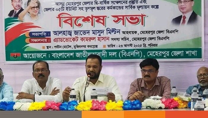 বিএনপির ৪৭তম প্রতিষ্ঠাবার্ষিকী এবং আসন্ন মেহেরপুর জেলা দ্বিবার্ষিক সম্মেলনের প্রস্তুতি ও জেলার ৫টি ইউনিটসহ তৃণমূল পর্যায়ের কার্যক্রমের সার্বিক মূল্যায়ন উপলক্ষে বিশেষ সভা অনুষ্ঠিত হয়েছে।