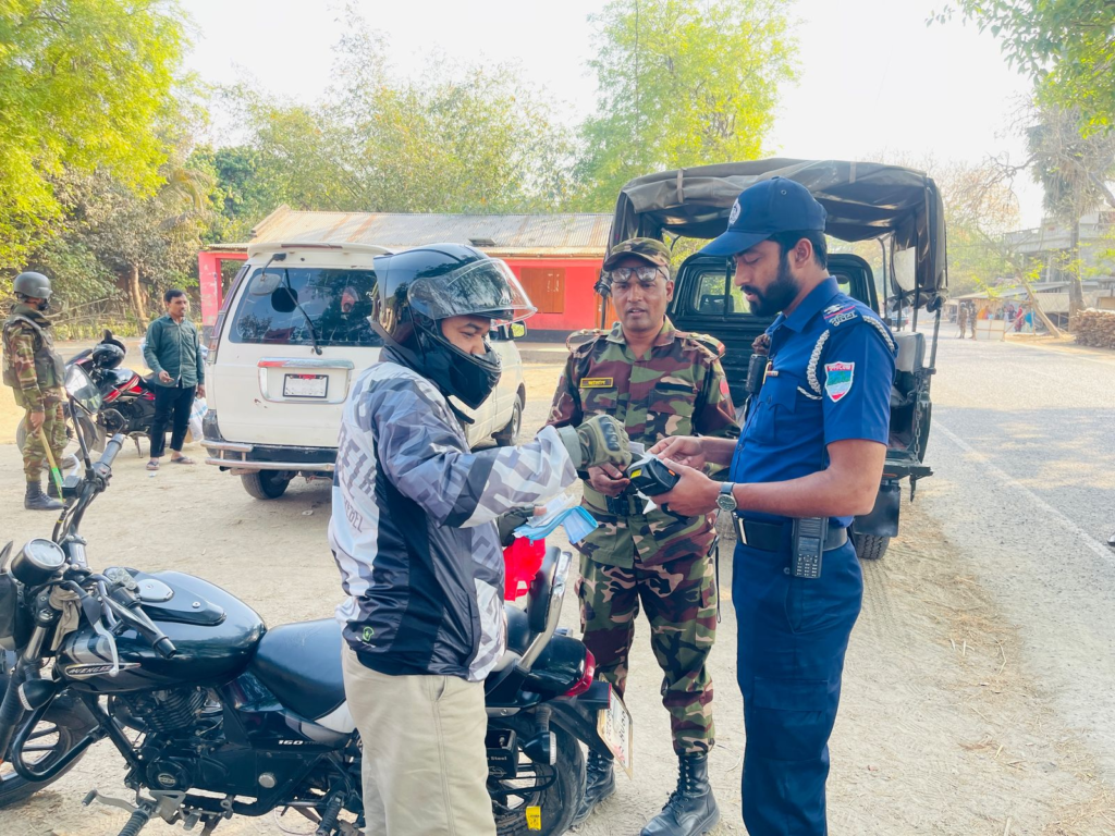 মেহেরপুরে সড়কের শৃঙ্খলা ফেরাতে যৌথ বাহিনীর অভিযান, ৯ মোটরসাইকেল আরোহীকে জরিমানা