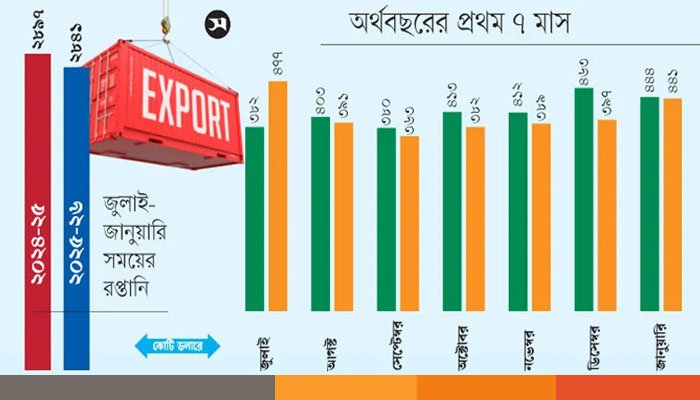 রপ্তানি উন্নয়ন ব্যুরো (ইপিবি) গতকাল সোমবার রপ্তানির হালনাগাদ প্রতিবেদন প্রকাশ করেছে। এতে দেখা যায়, চলতি অর্থবছরের জুলাই মাস থেকে জানুয়ারি মাস পর্যন্ত প্রথম সাত মাসে রপ্তানি আয় আগের অর্থবছরের একই সময়ের চেয়ে ১ দশমিক ৯৩ শতাংশ কম হয়েছে। রপ্তানি আয় এসেছে ২ হাজার ৮৪১ কোটি ডলারের। গত অর্থবছরের একই সময়ে যা ছিল দুই হাজার ৮৯৭ কোটি ডলার। অর্থাৎ চলতি অর্থবছরের গত সাত মাসে আগের অর্থবছরের একই সময়ের চেয়ে কম হয়েছে ৫৫ কোটি ডলার।