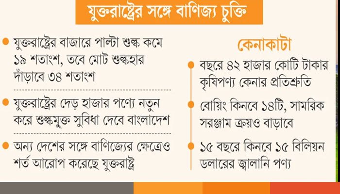 বাংলাদেশের পণ্য রপ্তানির ক্ষেত্রে যুক্তরাষ্ট্র পাল্টা শুল্কহার ১ শতাংশীয় পয়েন্ট কমিয়ে ১৯ শতাংশ করেছে। একই সঙ্গে বাণিজ্য চুক্তির আওতায় যুক্তরাষ্ট্র থেকে তুলা ও কৃত্রিম তন্তু আমদানি করে তৈরি করা পোশাক দেশটিতে রপ্তানি করা হলে তাতে কোনো পাল্টা শুল্ক আরোপ না করার ঘোষণা দেওয়া হয়েছে। এতে দেশটিতে সম্ভাব্য ক্ষতি এড়িয়ে রপ্তানি বাড়বে বলে মনে করছে সরকার। তবে এ সুবিধা পেতে দেশটির সঙ্গে বাণিজ্যে নানা ধরনের শর্ত মেনে নিয়েছে বাংলাদেশ।
