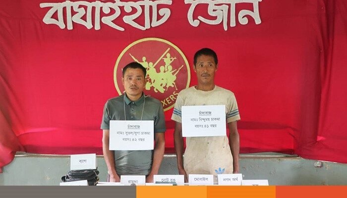 আটক দুইজন পাহাড়ের আঞ্চলিক রাজনৈতিক দল ইউনাইটেড পিপলস ডেমোক্রেটিক ফ্রন্টের (ইউপিডিএফ) সদস্য। আটকের সময় তাদের থেকে একটি দেশীয় পিস্তল (এলজি), দুইটি কার্তুজ, তিন রাউন্ড অ্যামুনেশন (বল), ১২টি চাঁদা আদায়ের রশিদ, ১২টি চাঁদা আদায়ের রশিদ বই, নগদ ৪০০ টাকা, একটি মোবাইল ফোন, একটি হিসাবের খাতা, একটি চাপাতি, একটি রামদাসহ অন্যান্য সরঞ্জাম জব্দ করা হয়।
