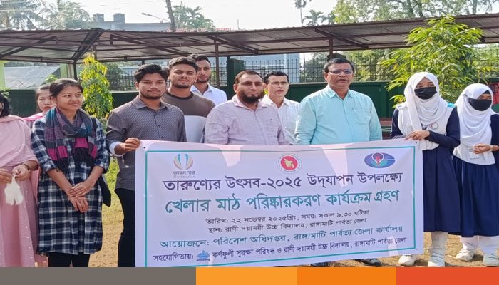 তারুণ্যের উৎসব-২০২৫ উদযাপন উপলক্ষে রাঙামাটিতে সচেতনতামূলক র্যালি, খেলার মাঠ পরিষ্কার ও বর্জ্য ব্যবস্থাপনা নিয়ে ক্যাম্পেইন অনুষ্ঠিত হয়েছে। শনিবার (২২ নভেম্বর) সকালে পরিবেশ অধিদপ্তরের আয়োজনে রাঙামাটির রাণী দয়াময়ী উচ্চ বিদ্যালয়ে এ কর্মসূচি পালিত হয়।