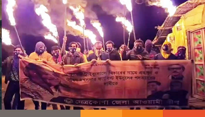 বাংলাদেশ যুবমহিলা লীগ ফেসবুক পেইজে পোষ্ট করা এক মিনিট নয় সেকেন্ডের ভিডিওতে মুখে মাস্ক পরিহিত আনুমানিক ২০-২৫ জনের মতো নেতাকর্মীদের মশাল মিছিলে বিভিন্ন শ্লোগান দিতে দেখা গেছে। ব্যানারে লেখা ছিল- “আইসিটি ট্রাইব্যুনালে বিচারের নামে প্রহসন ও অবৈধ দখলদার ফ্যাসিস্ট ইউনুসের পদত্যাগের দাবিতে বিক্ষোভ মিছিল”।