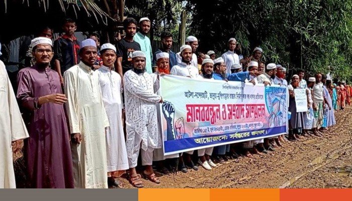 ঠিকাদারী প্রতিষ্ঠানের উদাসীনতার কারনে, গ্রামীণ অবকাঠামো উন্নয়ন প্রকল্পের রাস্তাটি যেনো মরণ ফাঁদে পরিনত হয়েছে। প্রায় প্রতিদিনই ঘটছে ছোটবড় দুর্ঘটনা। রাস্তার সংস্কার কাজ দ্রুত বাস্তবায়নের দাবীতে রবিবার (১৫ জুন) বিকেলে ঘন্টাব্যাপি মানববন্ধন করছে এলাকার সর্বস্তরের জনগণ।