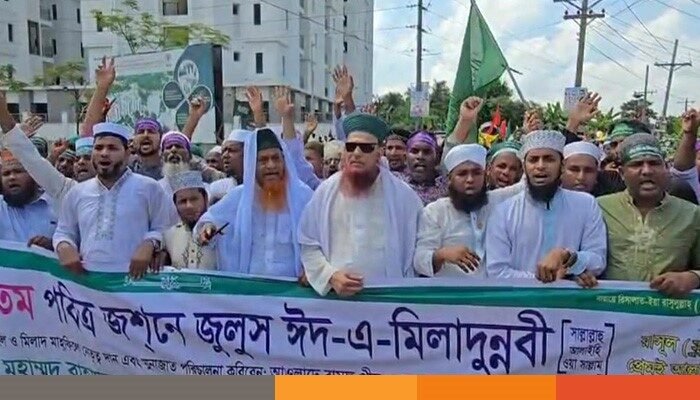 নারায়ণগঞ্জের রূপগঞ্জে বাংলাদেশ হিজবুর রাসূল (স.) কমিটি, রূপগঞ্জ উপজেলা শাখার আয়োজনে জসনে জুলুস মিছিল করেছেন স্থানীয় সুন্নী মুসলমানরা।